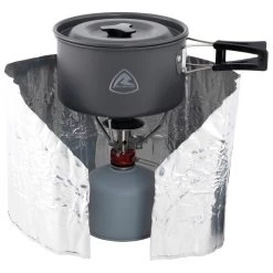 Praktisch und leicht – das Mini-Kochset für eine Person. Speziell entwickelt für den Wettbewerb KIMM (Karrimor International Mountain Marathon). Bestehend aus einem Spiritusbrenner und einem Topf (0,8 l) aus Aluminium, Deckel/Bratpfanne (15 cm) sowie Windschutz und Zange.