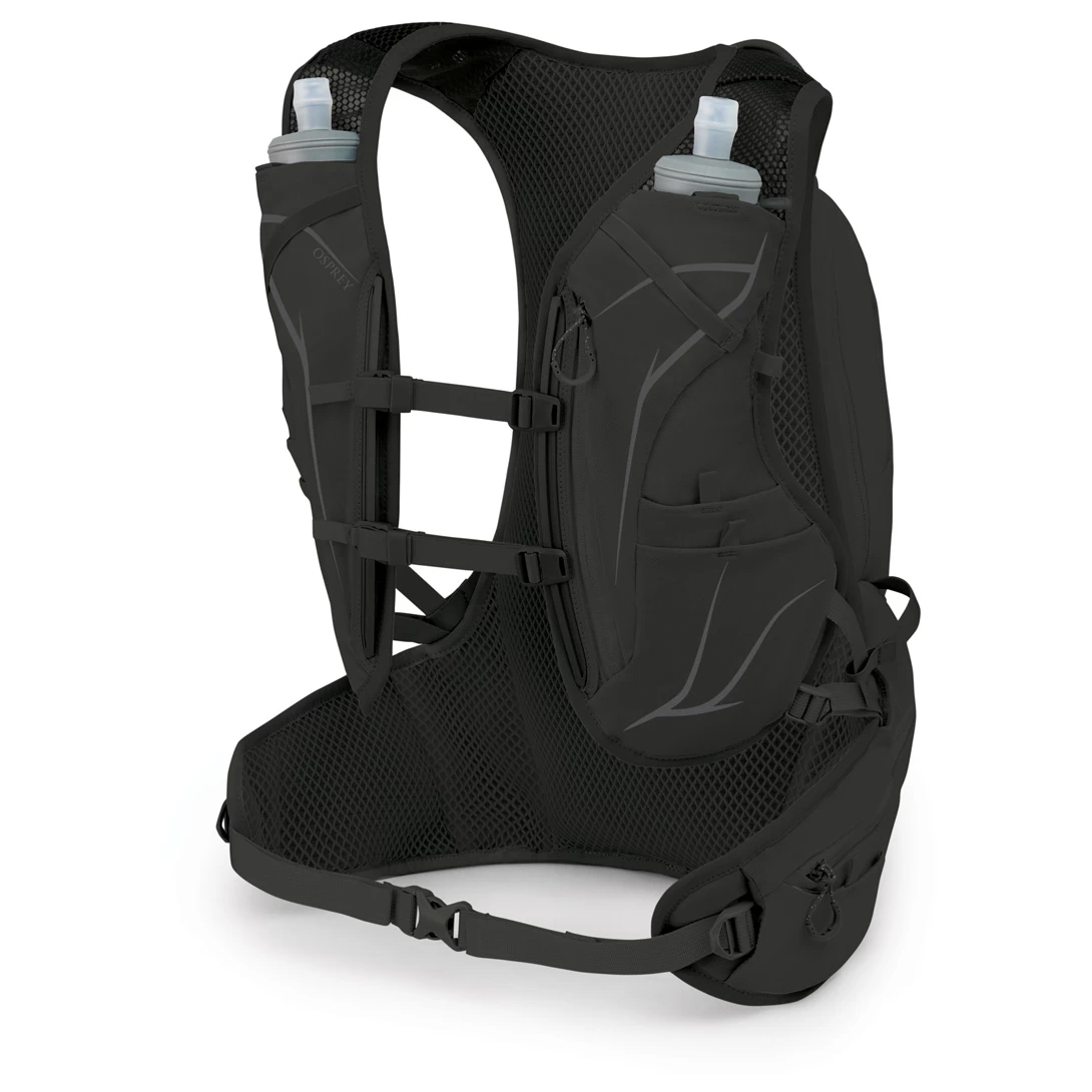 Er kommt mit einem wasserabweisenden, robusten Material daher. Das Mesh am Rücken bietet eine solide Atmungsaktivität. Im geräumigen Hauptfach und den zusätzlichen Außentaschen bringst Du von Verpflegung bis Equipment alles unter. Am Hüftgurt und an den Schulterträgern findest Du weitere Taschen, die den Stauraum erweitern. Dein Handy hat eine separate Tasche, damit es griffbereit ist. Mit dabei sind zwei Trinkflaschen, die optimal in die beiden Taschen am Schulterriemen passen. Mit der westenähnlichen Passform bietet der Rucksack einen sicheren Sitz für sportliche Läufe. Einfach durchdacht!