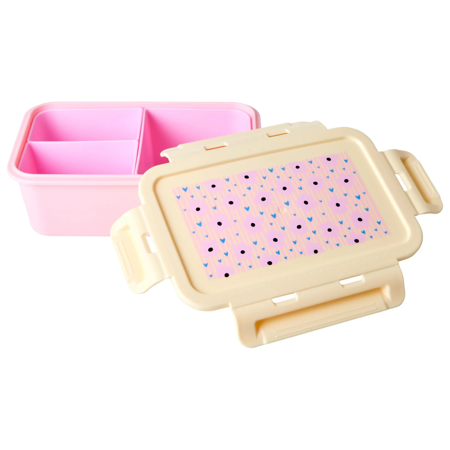 Perfekt für Kita oder Schule: die schöne Lunchbox with 3 Inserts von Rice! Die Brotdose mit einem Deckel mit Klickverschlüssen ist auf der Innenseite mit drei praktischen Fächern ausgestattet, die bei Bedarf auch teilweise oder komplett herausgenommen werden können.